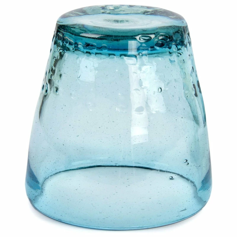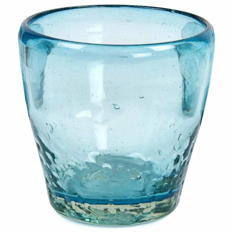 Javier and Efr’n select a delicious shade of blue for these barrel-shaped juice glasses. Featuring six in the set, each glass is masterfully crafted by hand with millenary blown glass techniques whereby the artisan picks the molten glass with one end of a metal pipe. He then turns the pipe while at the same time blowing through it as well as shaping the glass with his free hand.