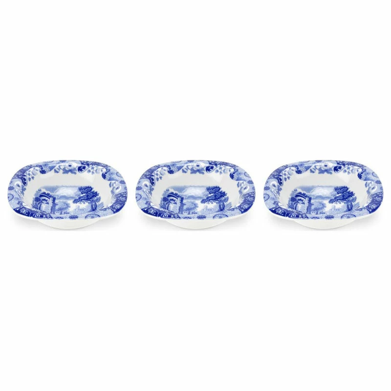 The Spode Blue Italian Dip Dish Set is an iconic dip set crafted out of fine materials and designed with a timeless style. Spode is well known for creating beautiful authentic Italian inspired dishes that elevate our kitchen counters and dining tables. The Blue Italian Collection was made possible by Josiah Spode’s perfection of blue under-glaze printing in 1784 and features extensive, eclectic and imaginative blue and white tableware and cookware that takes you and your guests to the picturesque romantic countryside of Italy. The central scene decorating this dish is based upon a late 17th Century drawing depicting Italian ruins in a pastoral landscape, while an 18th Century Chinese-inspired pattern adorns the outer edges. It comes in a set with 3 dip dishes; each dish has a width of 5 inches. Crafted out of high-quality fine porcelain with a rock hard, clear underglaze to showcase the vibrancy and beauty of the patterns. This is the perfect versatile dish set to add to your serving collection; use it to serve your favorite dips at a casual or formal dinner party. Crafted from Spode’s Imperial Ware for modern-day living, each piece can safely be placed in the freezer, microwave, and oven (warm oven only – Oven Safe to 340 degrees); dishwasher safe makes for easy cleanup. (Never place empty items in microwave or oven.)