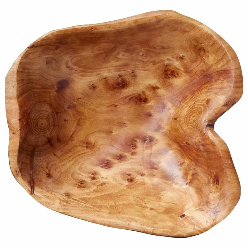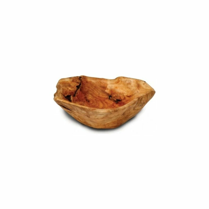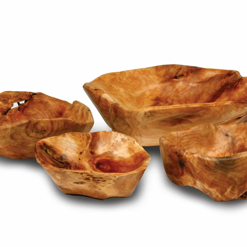 Each of our hand carved root bowls is uniquely beautiful and stands alone as a natural work of art. These fantastic pieces are carved from a species of Chinese fir called Shan Mu, which grows abundantly in the mountains of central China. The stumps left by logging are reclaimed prior to replanting and hand-carved by local artisans into the shapes in this collection. They are beautiful and practical items that bring their own unique organic charm into the home. Each piece is a one-of-a-kind. Food-safe lacquer finish. Hand wash. Knotholes and minor cracks add character.
