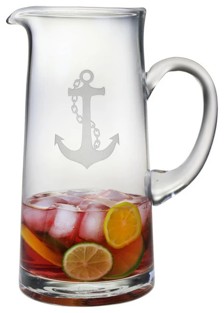 Each sturdy pitcher holds 60 ounces and features a stand etched anchor design. Dishwasher safe. Decorated in the USA.