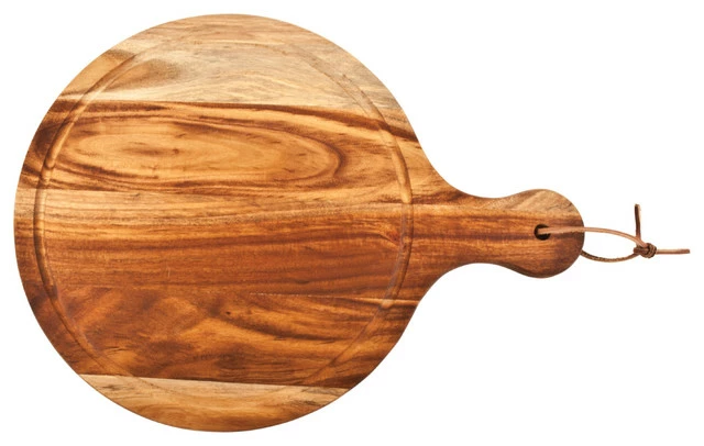 Our round acacia wood cheese paddle is as useful as it is decorative. The gorgeous board is perfect for serving or cutting and, hanging from its faux leather strap, it adds a farmhouse touch to your decor.