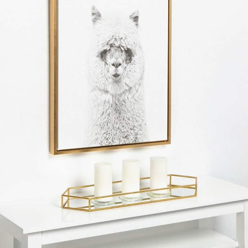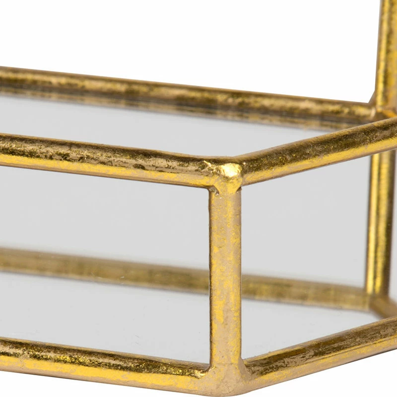 - Accent tray is constructed of metal with gold leaf finish and mirrored glass