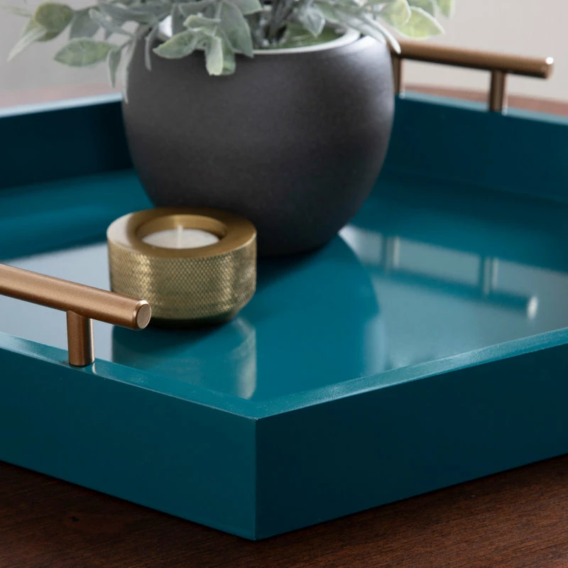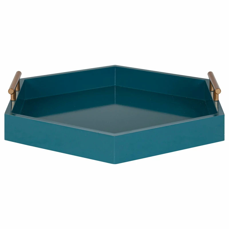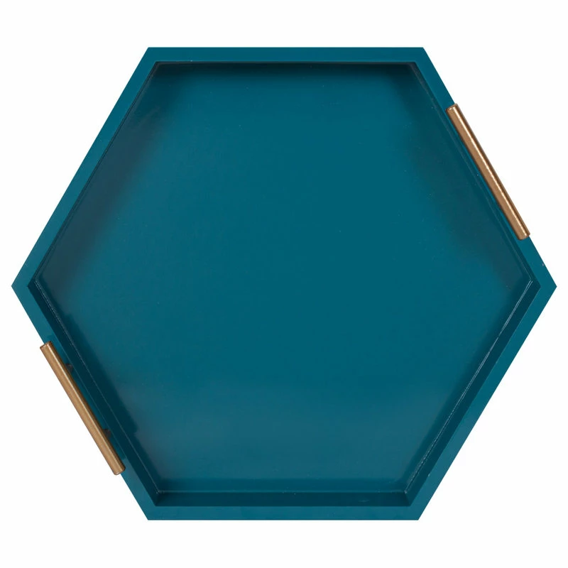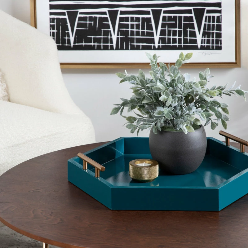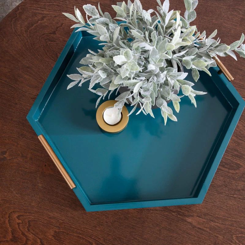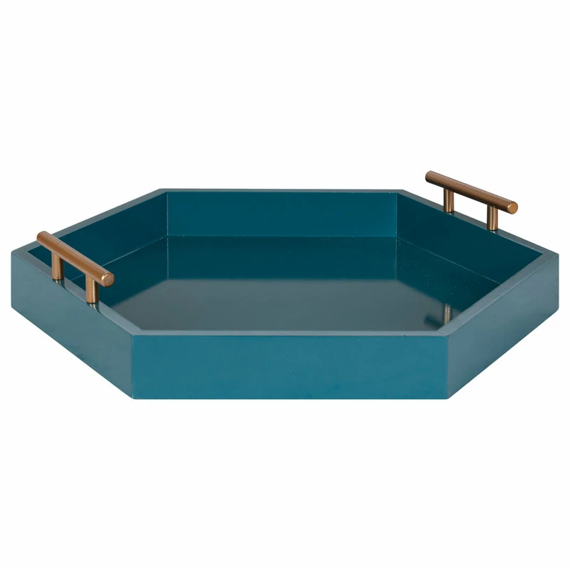 Bring modern glam style into your home with this hexagon-shaped decorative accent tray. The Lipton tray is perfect for showcasing mid-century modern style with its glossy teal finish and unique shape. Place this charming tray on your entrance console table as a trinket tray to hold your keys and mail, as a serving tray for your next fancy get-together, or as a makeup tray next to your vanity. This tray can also be used as a decorative accent on an ottoman to hold your media remotes or on a console as a decorative surface for plants, photos, and other family keepsakes. Constructed of lightweight material with a glossy finish and metal handles, this tray is sturdy yet refined, giving your home a beautiful mid-century theme with a practical design. The tray measures 18 inches wide, 18 inches deep, and stands 3.25 inches high, giving you plenty of room for various purposes. The Lipton allows you to bring a chic and glamorous decorative accent into your home that helps you layer your decor and provides you with another functional space to play with.