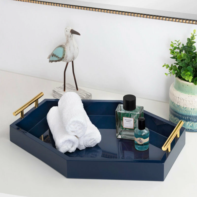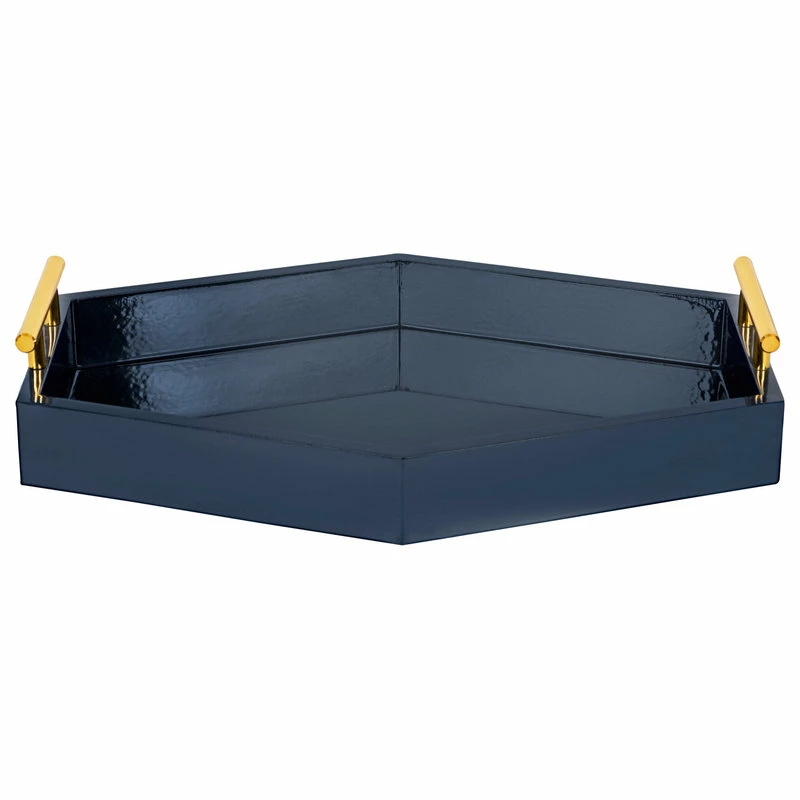 The Lipton Trays combine practical storage with decorative elegance in this new shape by Kate and Laurel. Taking inspiration from elegant geometric forms, this beautiful tray has an oblong, hexagon shape, thoughtfully crafted with both storage and display in mind. This particular edition of the Lipton Tray also has a glossy, chic navy blue finish, with polished gold metal handles for extra glamorous detail. Use the 16.5 inches wide by 12 inches long size for storage of media remotes, small beverages, or decorative plants. It’s not only excellent for your living room, either; use it as a decorative centerpiece in your dining room, as a cute catch-all in your entryway, a storage area for your precious art supplies, or a large jewelry tray in the bathroom. With the right coasters and small plates, you could even use it as a decadent serving surface for a cheese plate and cocktails. This tray comes fully assembled right out of the box, so it is ready to use as soon as it arrives.