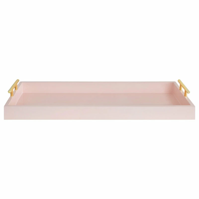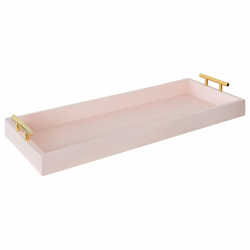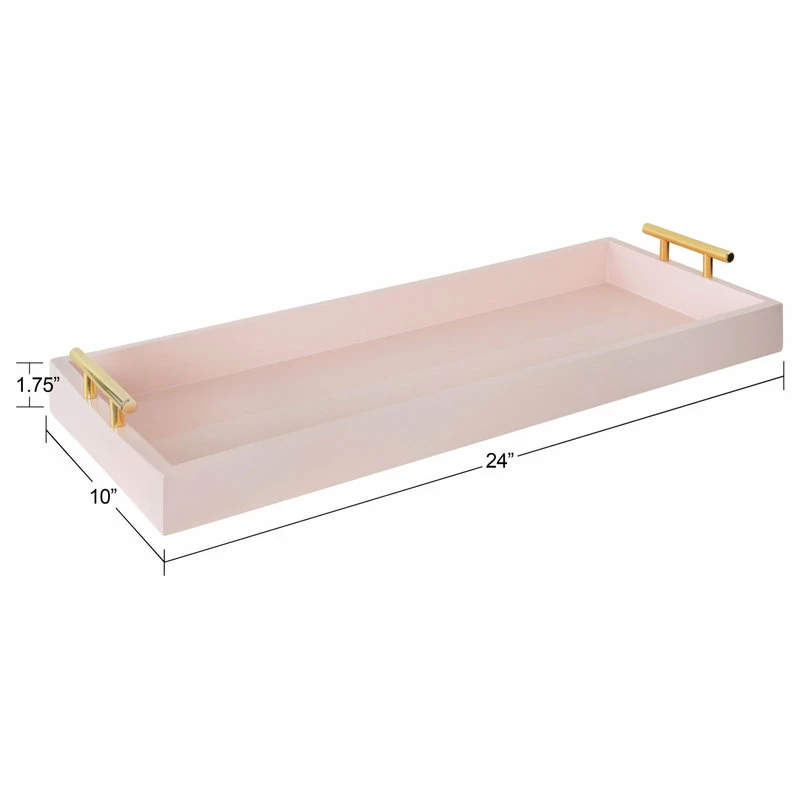 The glamorous style of the Lipton tray collection has been updated for added value with a long sleek shape! This new elongated rectangular tray is as striking as it is useful. Place this sophisticated accessory on your entrance console table as a place for trinkets or to hold your keys and mail as you come and go. Use it as a decorative accent on your coffee table or on your vanity to organize your make up. Constructed of wood with a high gloss finish and polished metal handles, it is sturdy enough to serve a line of champagne flutes to your poshest guests. The tray has pads on the bottom to protect your furniture surfaces and measures 24 inches long, 10 inches wide and stands 3.25 inches high.