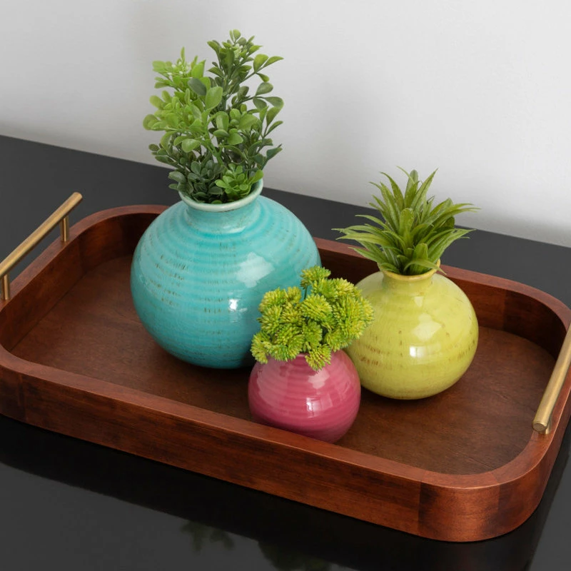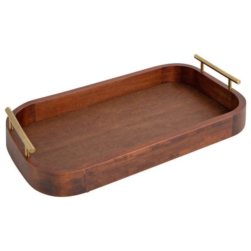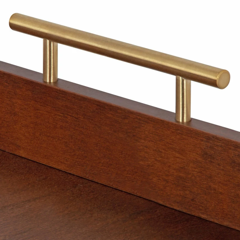 Mid-Century functionality has never looked so good with the beautiful wood Lipton Tray from Kate and Laurel. This edition of our popular Lipton line features a bold walnut wood finish for that elegant mid-century modern edge. Its functional metal handles also elevates your decorative aesthetic with a brushed gold finish, drawing the line and creating a beautiful statement. This Lipton has a radius rectangle design, with rounded edges and a total size of 18 inches long by 10 inches wide. This generous size gives you plenty of room to display small plants, store jewelry and lotions, or simply give you a place to put your media remotes. It also functions as a great serving tray, so long as you remember the coasters and plates! Mid-century modern design stands out in any room its placed in, but this particular tray looks spectacular in any living room, entryway, bedroom, bathroom, or kitchen. It’s excellent for hardwood surfaces. too, thanks to the protective pads securely attached to the bottom to prevent scuffing.