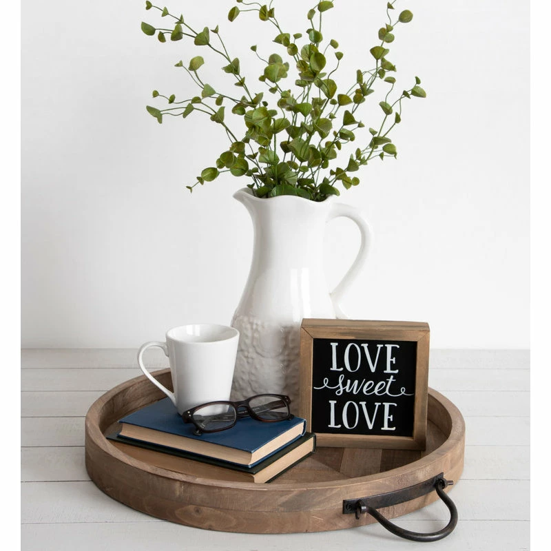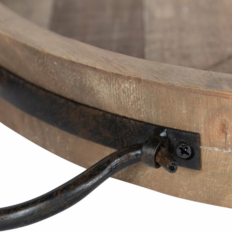 Decorate your home in rustic modern style with this circular wooden tray with black metal handles. Place this charming tray on your coffee table to hold a vase of flowers or on your dining table as a centerpiece. It can also be used as a decorative accent on an entrance console table for a great place to throw your keys, wallet, etc. Arrange an assortment of beautiful jars on it for a unique look in any room of the home. This accent tray is constructed of solid wood using two-toned weathered finishes to make a handsome square-in-a-square pattern. It measures 18 inches in diameter by 2 inches high and arrives completely assembled and ready for use. Decorate and organize in rustic chic style in any room of the home with this lovely accent tray.