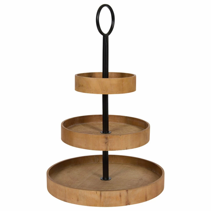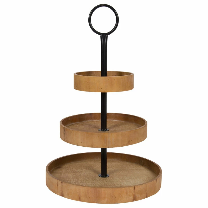 Organize your home in rustic farmhouse style with this three tiered solid wood tray. This charming tiered tray can be used to create a beautiful decorative centerpiece on your holiday table or any time of year. This tray can be used on a bathroom counter to organize your beauty accouterments, or it can be used on a kitchen counter or office desk for organization for your stationary, pens, and electronic devices. The smallest top tray has an 8 inch diameter, the middle tray has a 12 inch diameter, and the largest base tray has a 16 inch diameter. There is 6 inches of height between each tray. The decorative stacked trays are constructed of solid wood with a metal pillar topped with a convenient carrying loop. The overall dimensions are a 16 inch diameter by 24 inches high. This tray is easy to assemble and requires no extra hardware. Decorate and organize in rustic chic design in any room of the home with this lovely tiered tray.