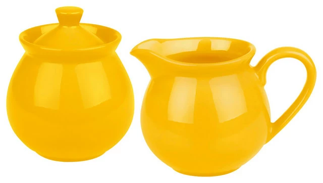 Complete your coffee or tea service with this Fun Factory Buttercup Sugar and Creamer. With their vibrant color and contemporary shape, these must-have kitchen accessories will look lovely on your table. Sugar bowl includes lid. Microwave and dishwasher safe. Sugar and creamer both 12oz.