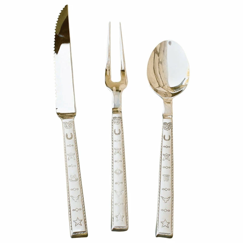 This luxurious collection of fine quality glassware offers exceptional clarity, finish, and craftsmanship. Dishwasher and microwave safe. Our flatware line 18/10 has been designed to enhance any western, lodge, or rustic table setting and is completely dishwasher safe. This four piece set can be used as shot glasses or as votive candle holders, and each piece is decorated with rope and ranch brands in rich dark brown.