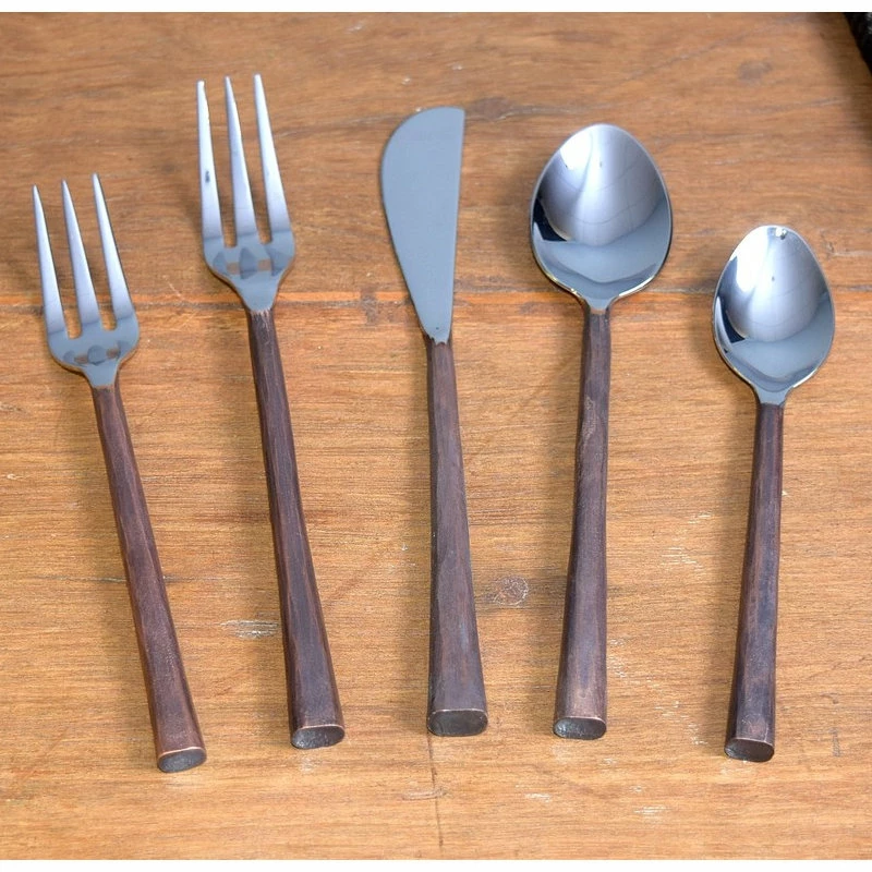 SKU: CUT006 Categories: Flatware, Flatware & Silverware Sets, Tabletop Tags: 18/2 stainless steel, 5 piece dinner set, Copper plated, Flatware, Global inspired, Hand forged
