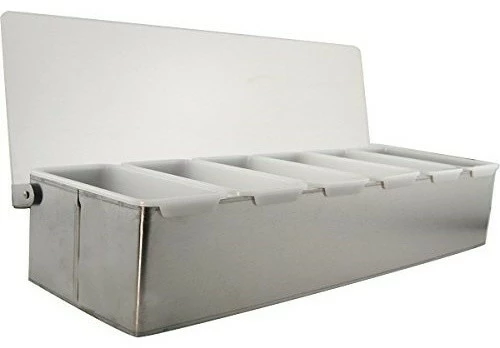 6 Compartment Condiment Bar Dispenser. Exterior made of tough stainless steel. Six removable plastic trays keep garnishes separate. Clear plastic lid allows you to see the contents. Durable for regular heavy-duty commercial bar or restaurant use. More than enough space for olives, cherries, oranges, lemons, limes and more!