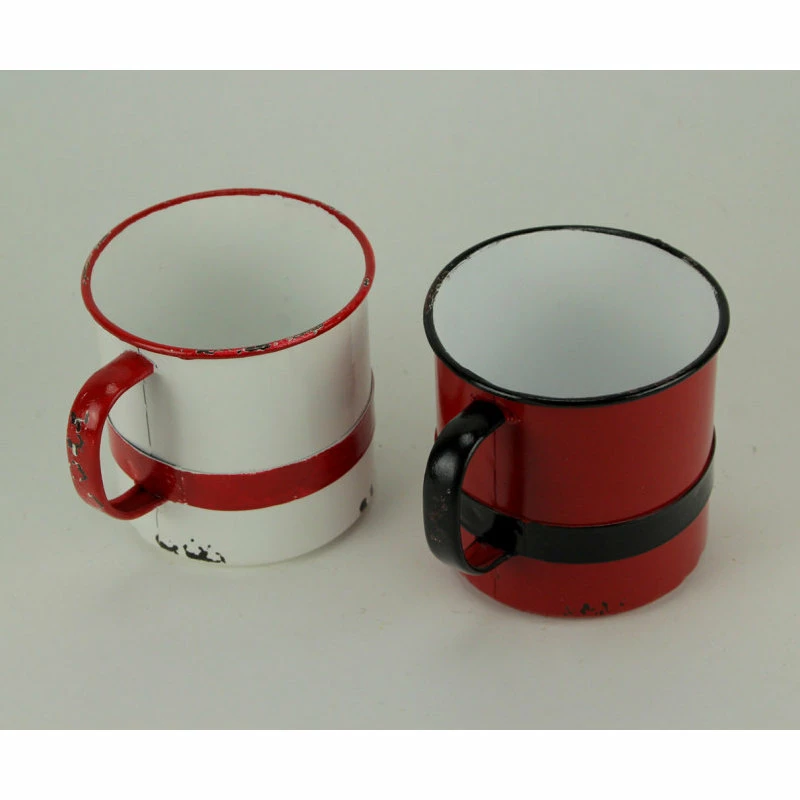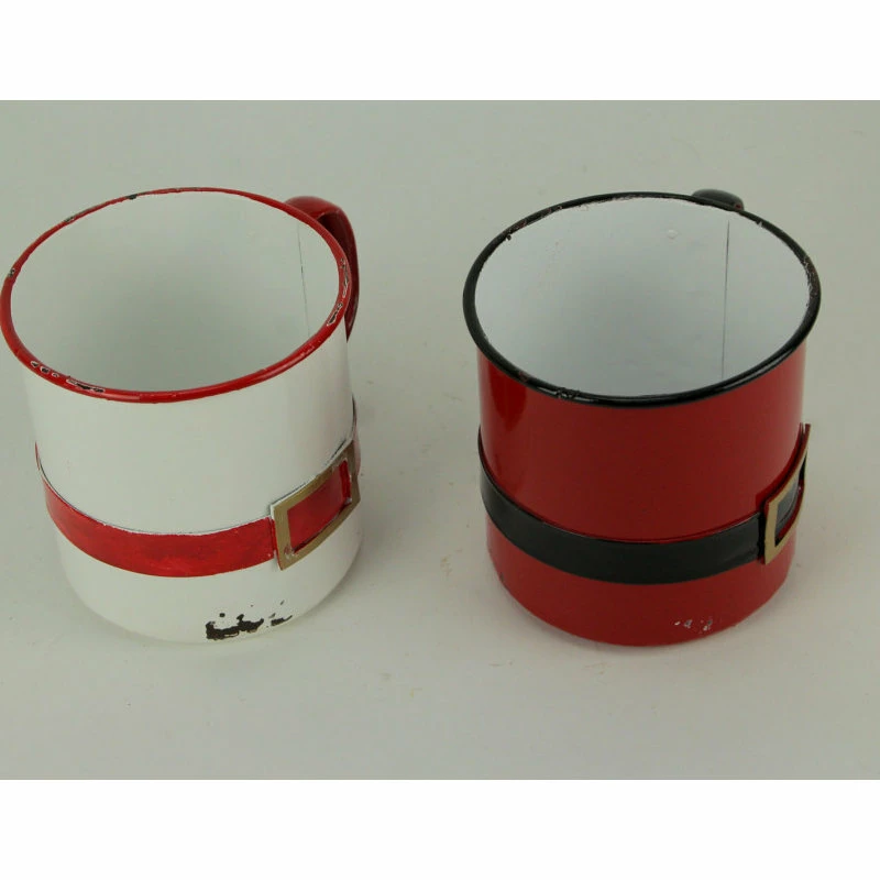 Bring a touch of nostalgia to your holiday home with this set of decorative Santa suit mugs. Place one next to the coffee maker and one on the dining table and fill them with wrapped candies, candles, small floral bouquets or holly. Wouldn’t they be cute with a pile of mini ornaments overflowing out of the top like bubbles. The mugs are made of metal in red and white enamel and look just like a classic Santa suit with a black belt around the middle. The finish has a wonderfully weathered appearance. Though they aren’t food grade, this set of 5.25 inch deep, 6.5 inch long, 5 inch wide Santa suit mugs bring holiday cheer to any home decor setting.