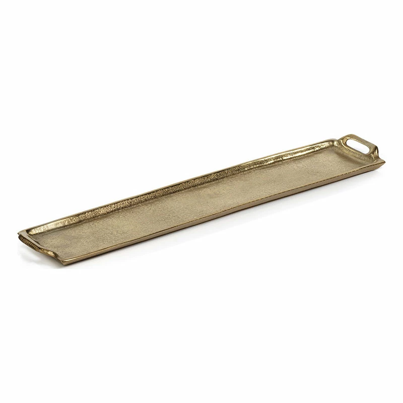 Decorate a console or coffee table with this rectangular tray. Made from raw aluminum with cut-out handles, this long rectangular tray is simple and chic. Use it to hold candles, vases, and other decorative items.