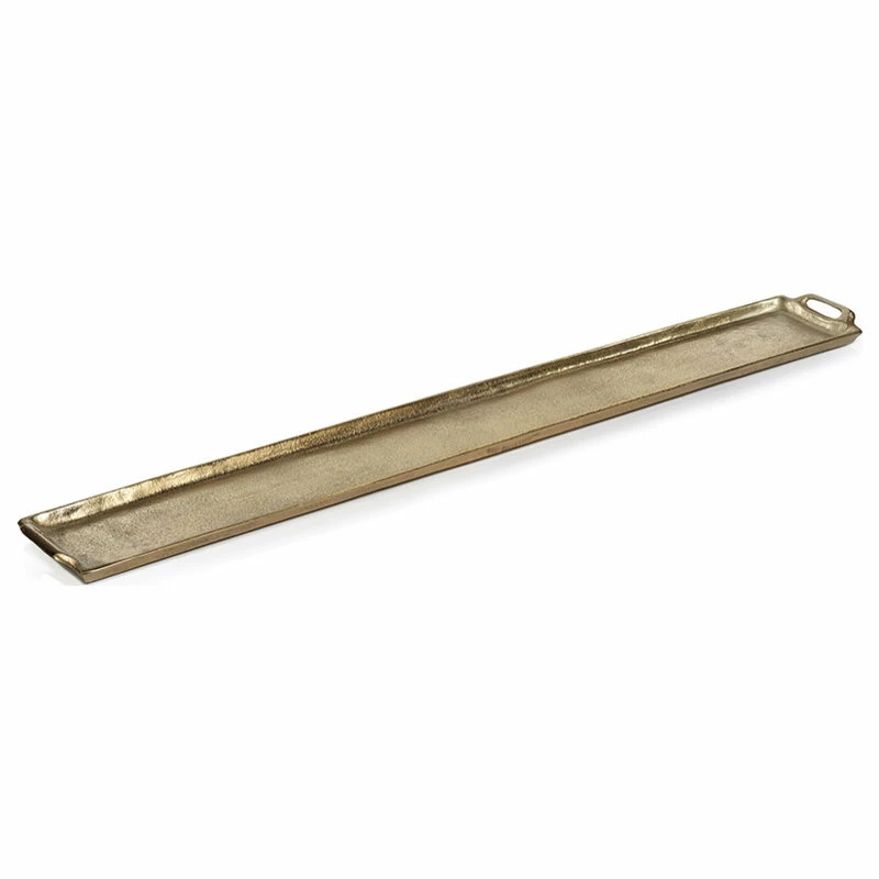 Decorate a console or coffee table with this rectangular tray. Made from raw aluminum with cut-out handles, this long rectangular tray is simple and chic. Use it to hold candles, vases, and other decorative items.