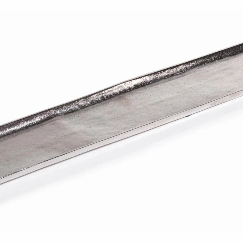 Decorate a console or coffee table with the Raw Nickel Tray. Made from raw silver nickel with cut-out handles, this long rectangular tray is simple and chic. Use it to hold candles, vases, and other decorative items.