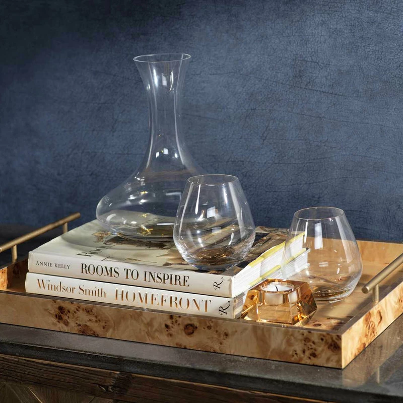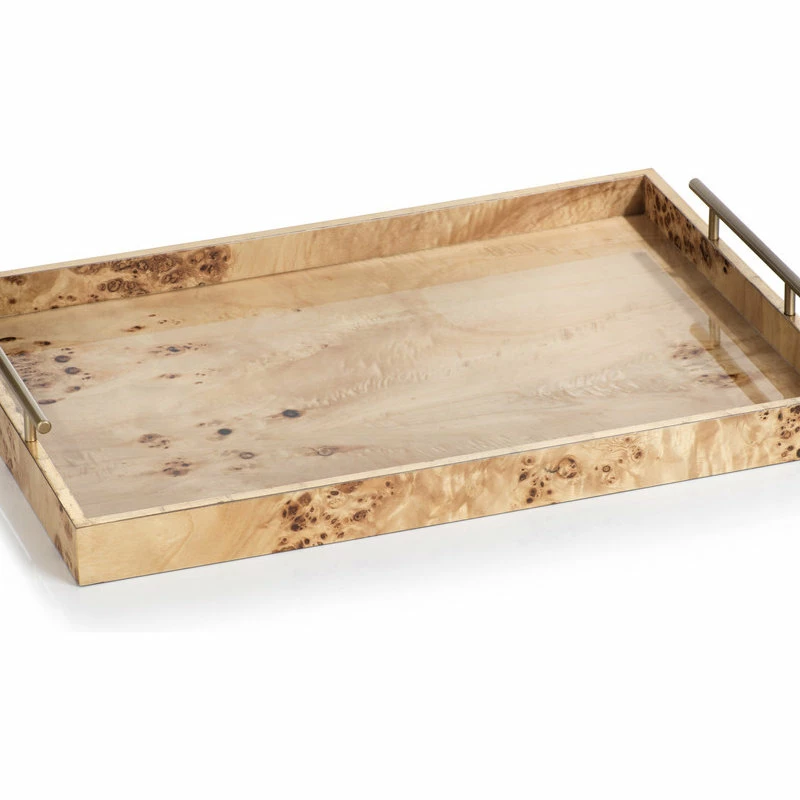 Beautiful bright honey veneer burl wood tray. Perfect rectangle shape with metal side handles for serving, displaying items on a coffee table, bar cart etc. *Natural burl wood veneer *With metal side handles *Made of MDF wood