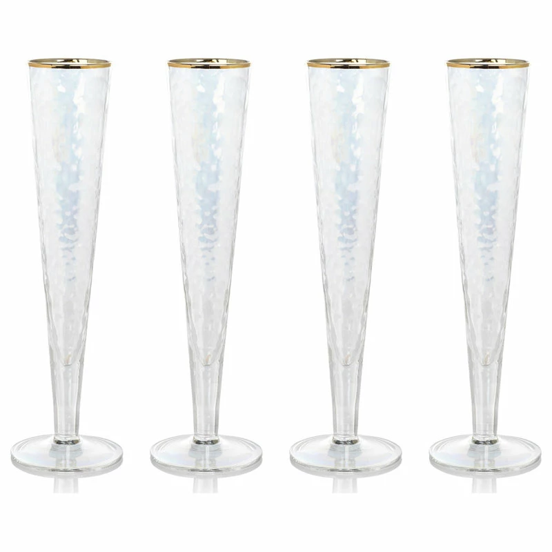 One of the festive and most fun ways to serve champagne is this set of champagne glasses. The luster glass is an updated version of the classic flute, emphasizing the contrast between its sleek, subtly-tapered silhouette and a striking gold rim. A marvel of simplicity and engineering, its slender and elegant design maximizes the formation of bubbles in champagne and sparkling wines. *4-Piece champagne flute set *Sassy slim tapered shaped lead-free glass *Ion-plated hammered glass with gold rim *Capacity: 6.5 oz. / 192 ml *Measures 2.75″ diameter x 9.25″H *Hand wash only