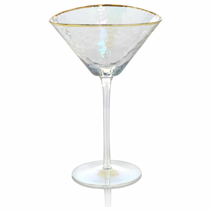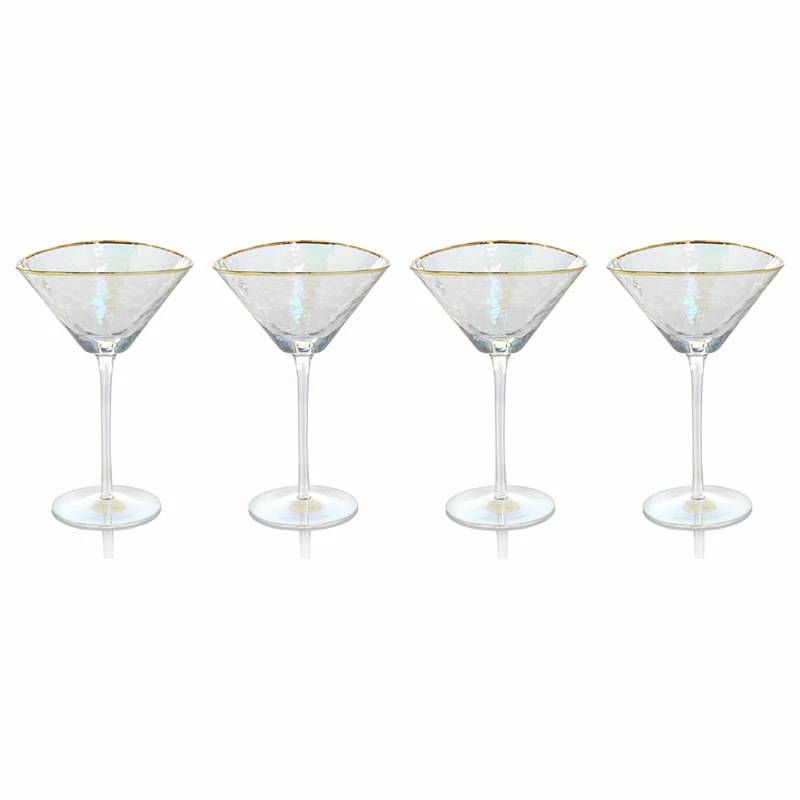 One of the festive and most fun ways to serve your guests is this set of martini glasses. Made of glass with luster finish, accented with a gleaming gold rim. The versatile functional coupe shape adds sass to martinis, champagne and craft cocktails. *4-Piece martini glass set *Ion-plated hammered lead-free glass *Unique ergonomic gold rim which is easy and comfy to drink from *Capacity: 8 oz. / 237 ml *Measures 4.75″ diameter x 7.25″H *Hand wash only