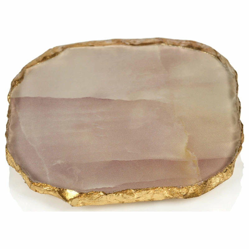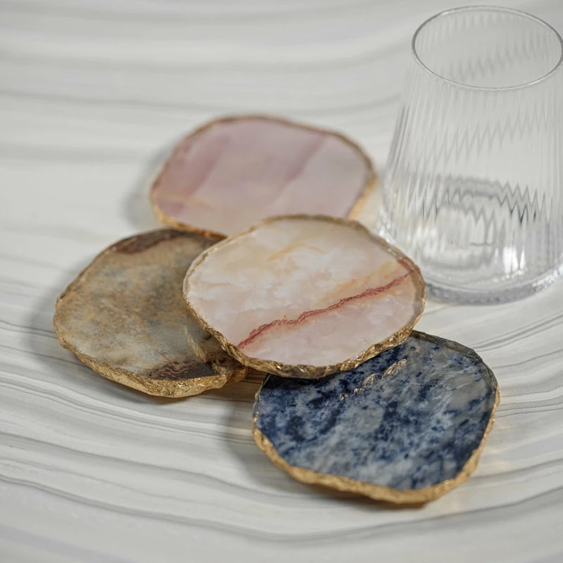 This elegant faux agate coaster set comes in varying colors and brings a slice of cultivated nature to the table. This piece channels some sophistication to your coasters by incorporating multicolored precious stones with a delicate golden trim. A beauty to behold on any coffee table, desk or console.
